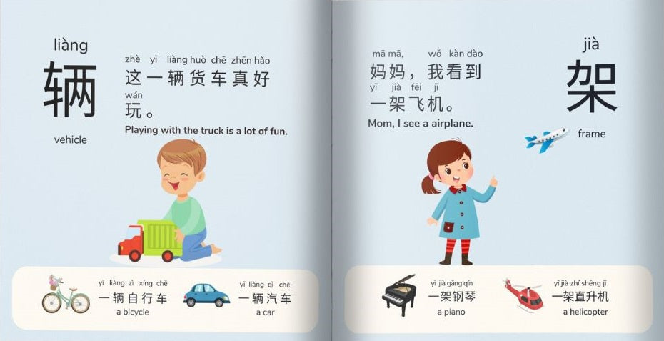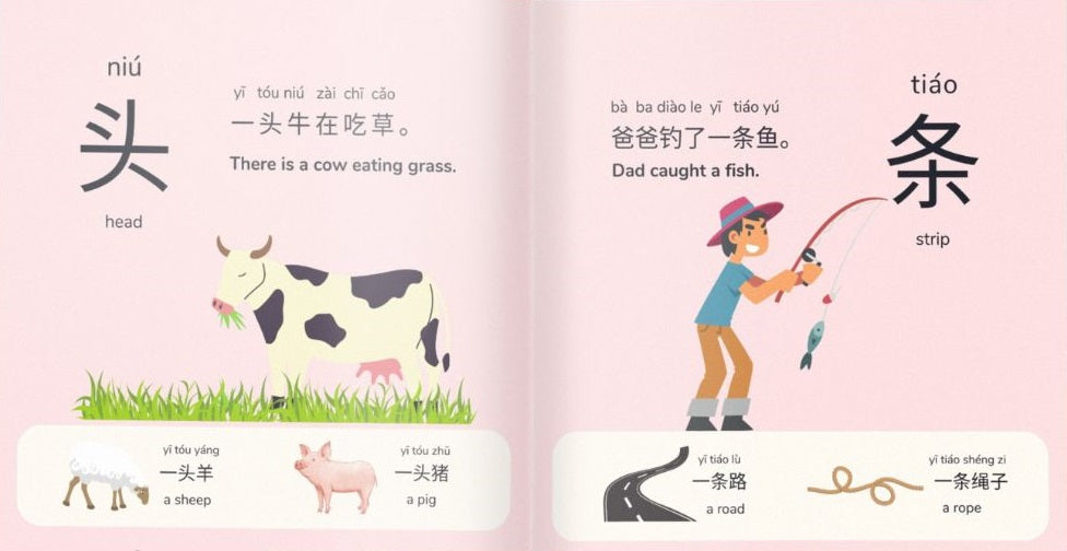 This bilingual children's book features 30 measure words like "双,条,块,架,头.....". They are essential in helping young children grasp the concept of using different measure words. Having access to this knowledge will enable them to use the correct measure words in simple conversations as they grow. Children are introduced to basic Chinese with short, simple sentences and bright illustrations.