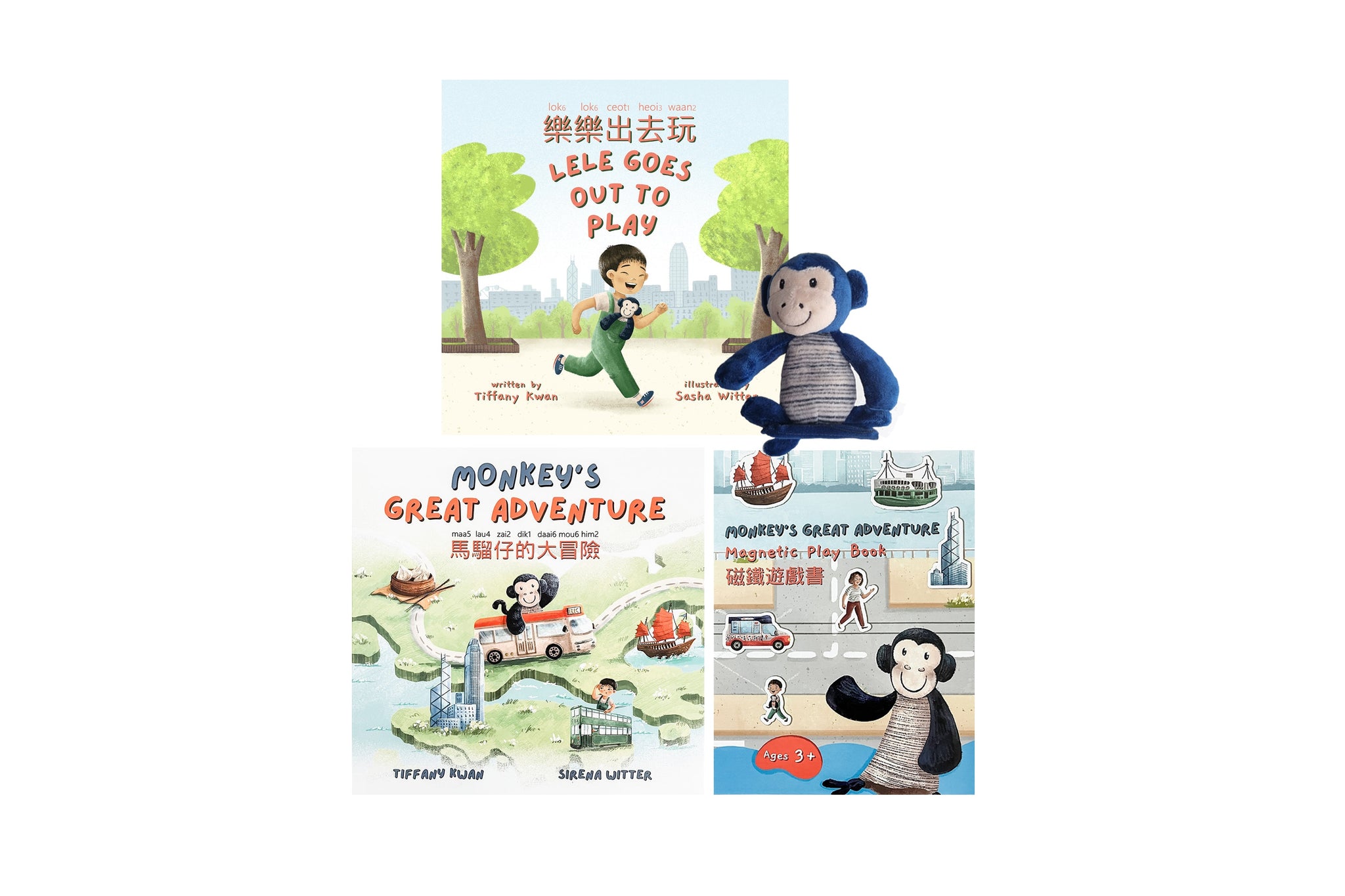 The books are in Cantonese (Traditional Chinese), Jyutping and English
